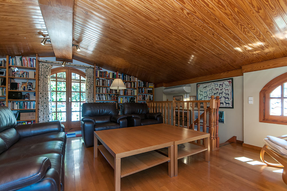 La casa está distribuida en 2 plantas y tiene acceso desde 2 calles. Ésta está distribuida en su planta baja en: recibidor, salón con chimenea, comedor con salida a terraza, cocina office con salida al porche, suite con baño, habitaciones y 2 baños completos. En la planta primera hay dos salas polivalentes independientes con entradas diferenciadas, una tipo estudio diáfano de 46 m2 con solárium de 15 m2 y otra del mismo tipos con acceso a buhardilla de 30 m2. En el semisótano hay otra sala polivalente con zona de aguas y gran garaje para 3 coches.