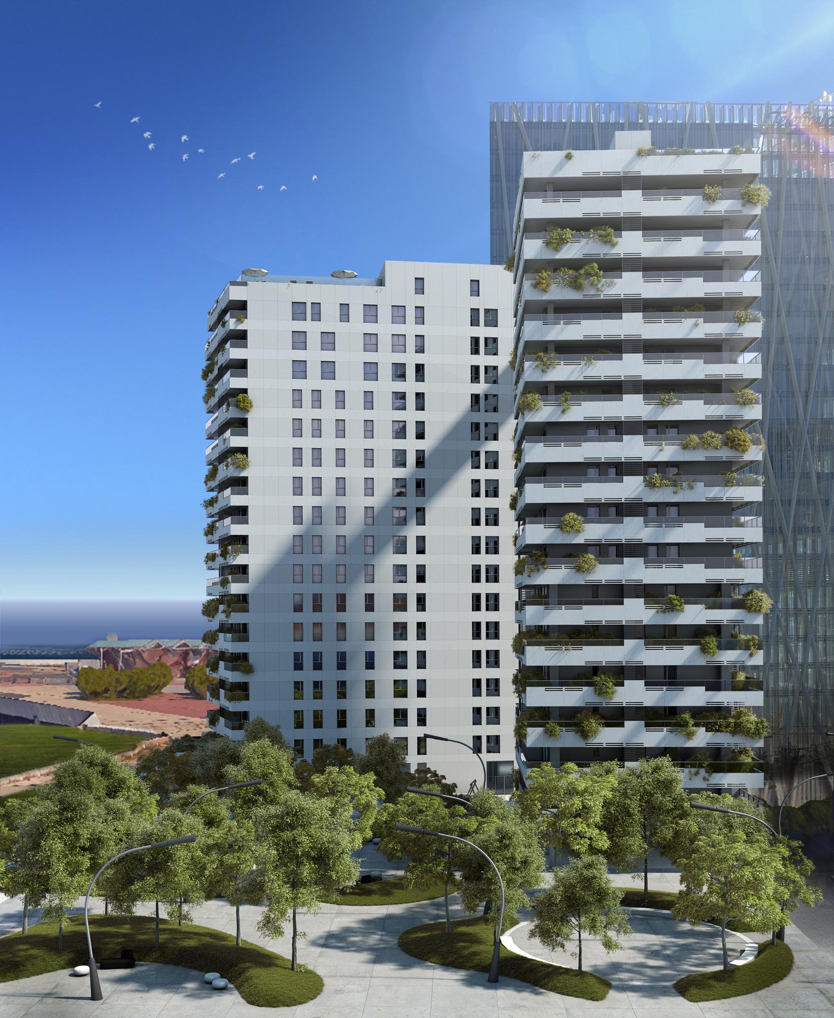 Diagonal Port es un conjunto residencial frente al mar, en el barrio de Diagonal Mar, donde se levantan dos espectaculares edificios de 16 plantas cada uno, que suman 143 viviendas de entre 1 a 5 habitaciones, y los áticos y primeras plantas cuentan con amplias terrazas.