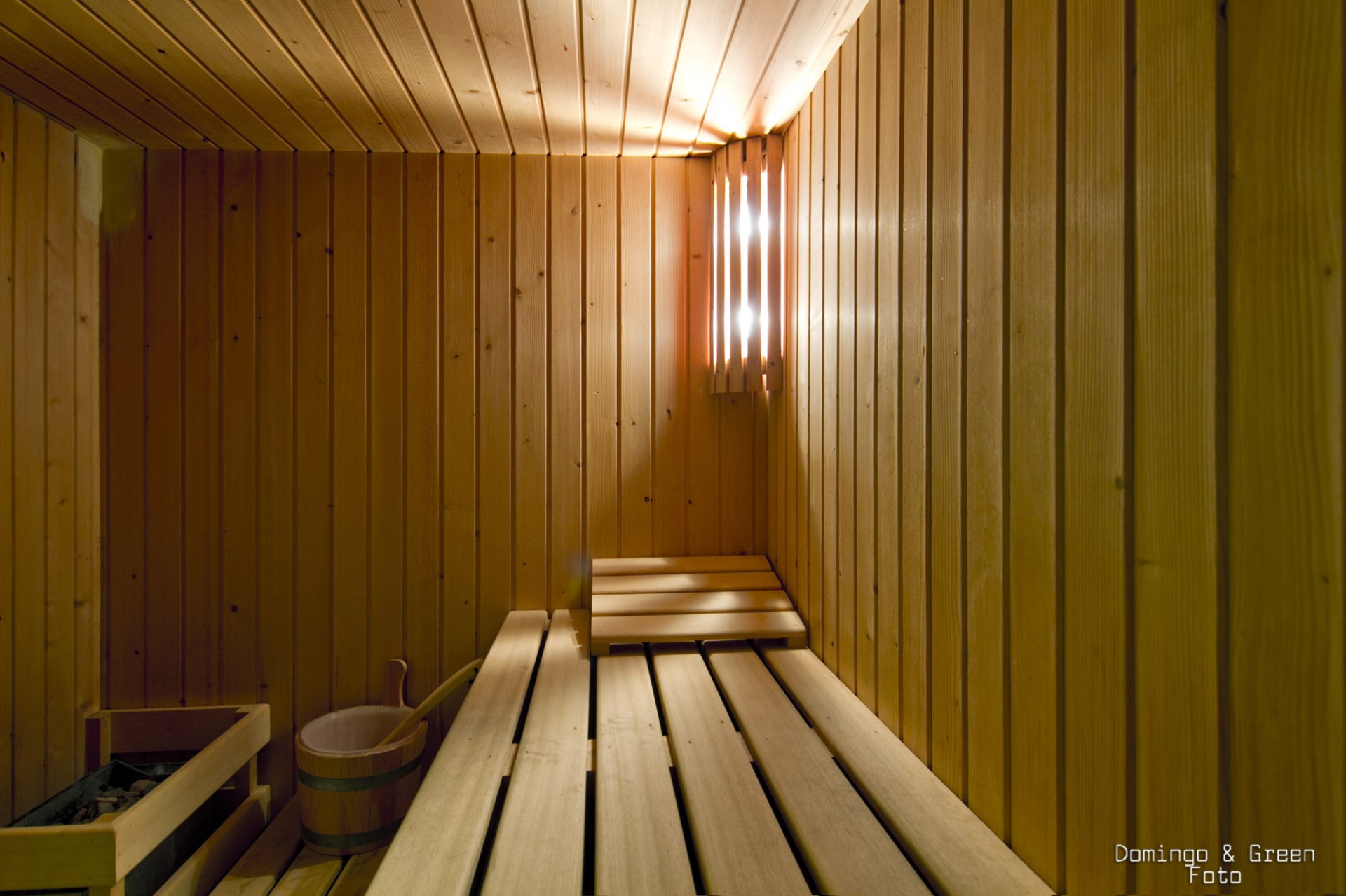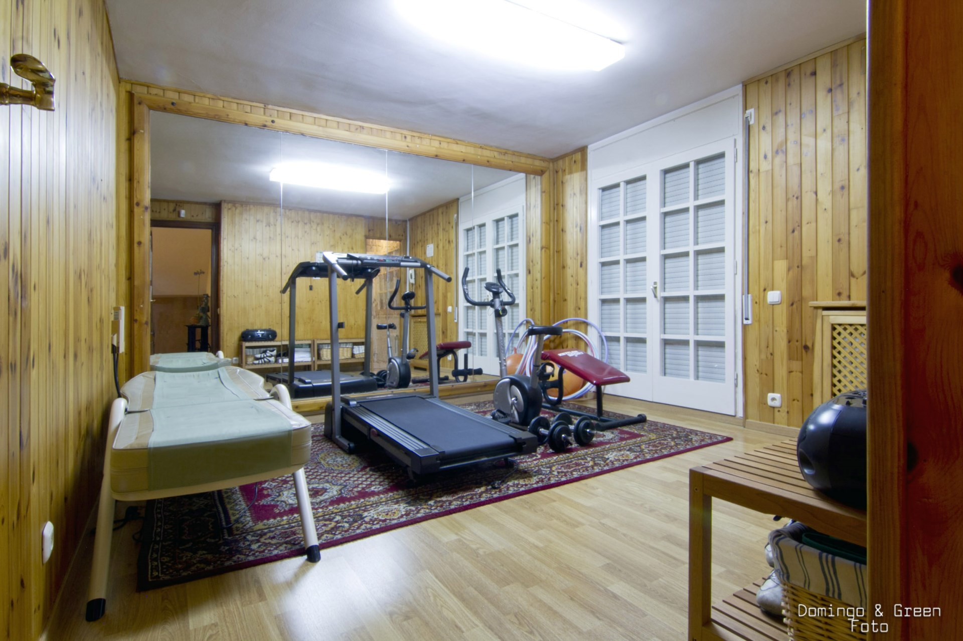 En la planta baja hay un amplio aparcamiento para 4 vehículos, el gimnasio con sauna y ducha escocesa y una habitación con salida a un pequeño jardín.