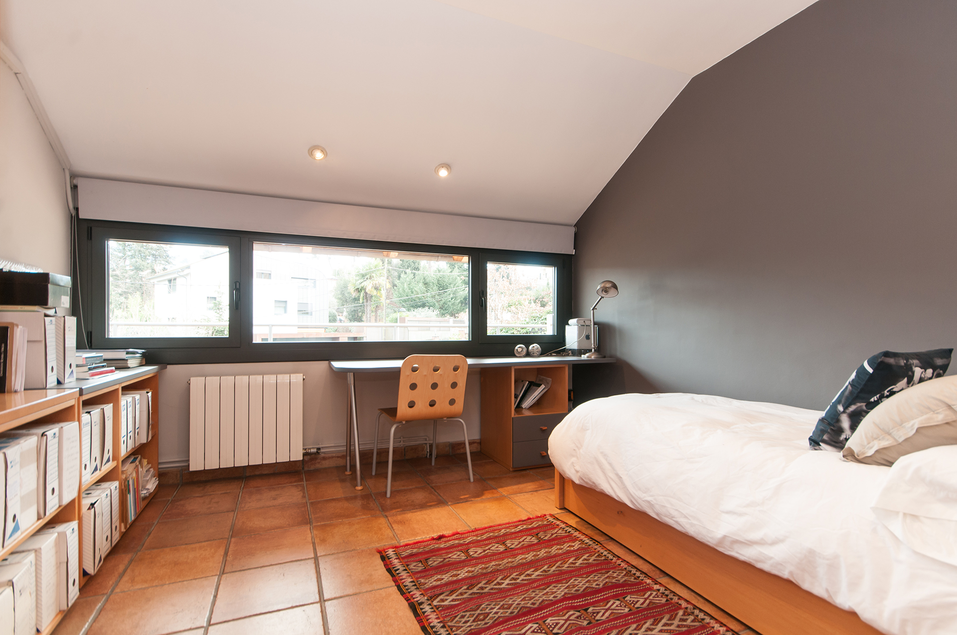 En la planta piso encontramos 2 habitaciones dobles, un estudio-despacho de 43 m2 con grandes ventanales y techos abuhardillados de madera, un baño completo, un aseo y una amplia terraza.