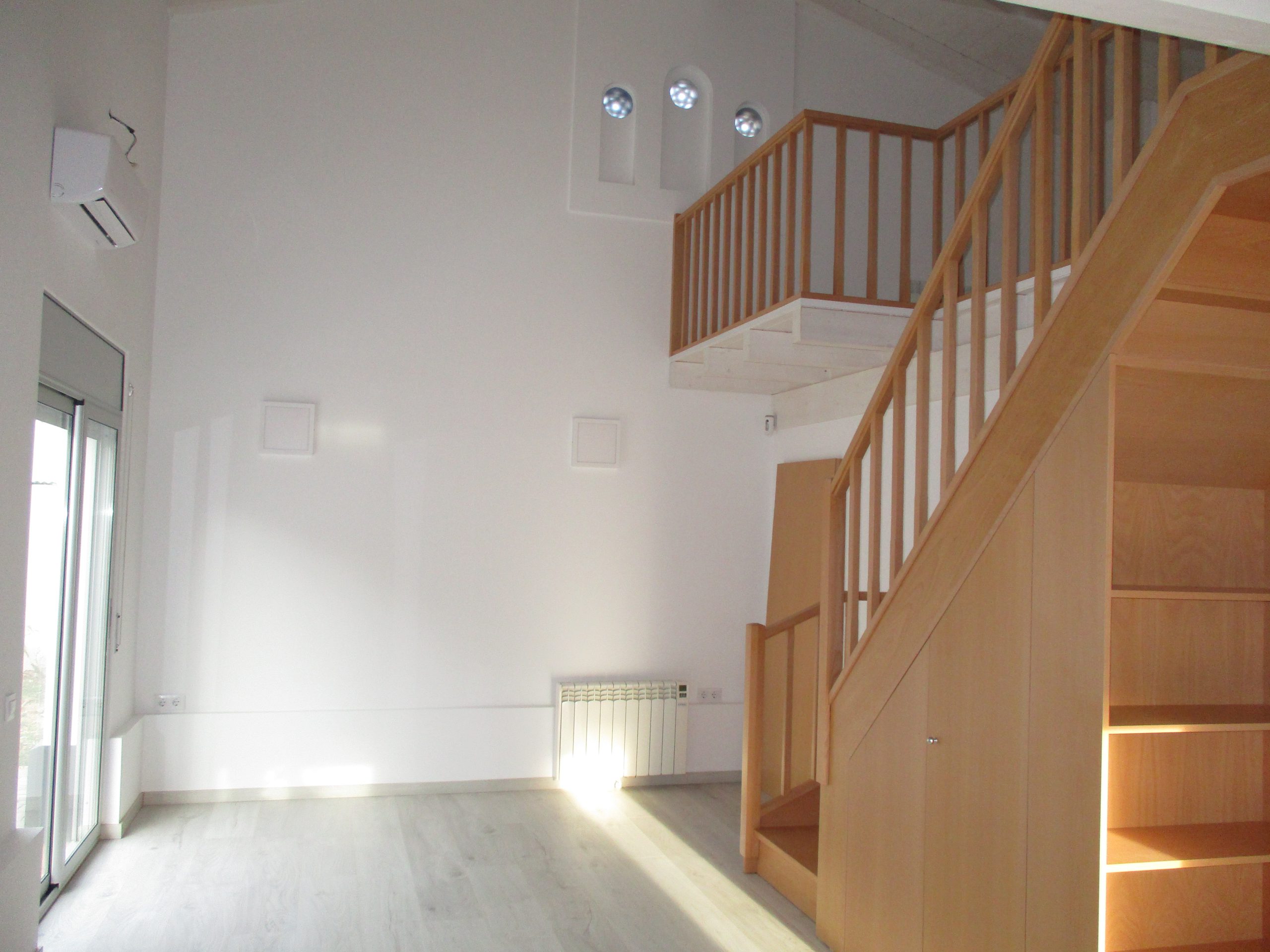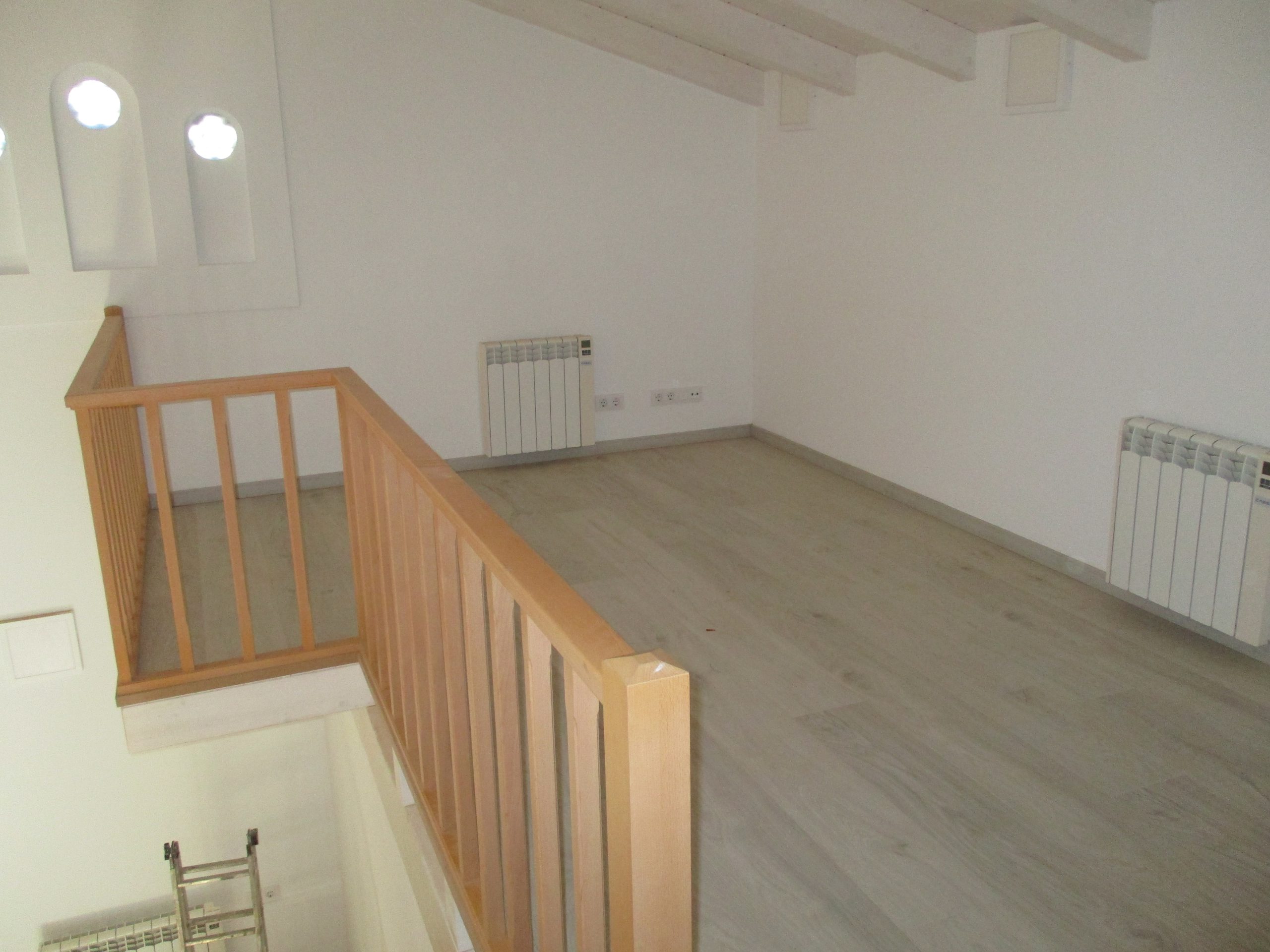 La distribución se estructura alrededor de una escalera de madera que une las dos plantas.