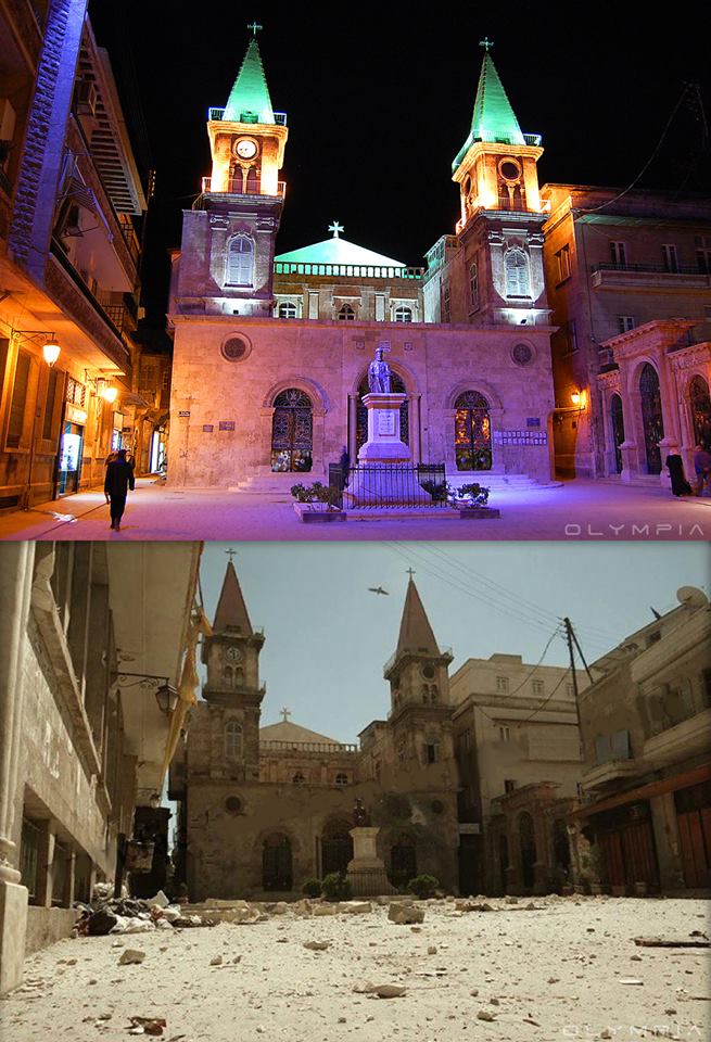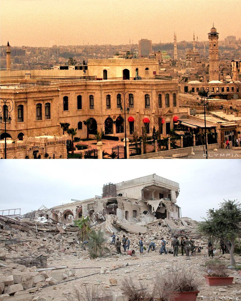 Després de 4 anys del conflicte sirià la ciutat d’ Aleppo, la més gran i més cosmopolita de l’estat, ha estat la més devastada pels bombardejos. El restaurant Olympia, situat a la mateixa ciutat, ha publicat a la seva pàgina de Facebook una sèrie de fotografies on es mostra l’abans i el després de la sagnant guerra.