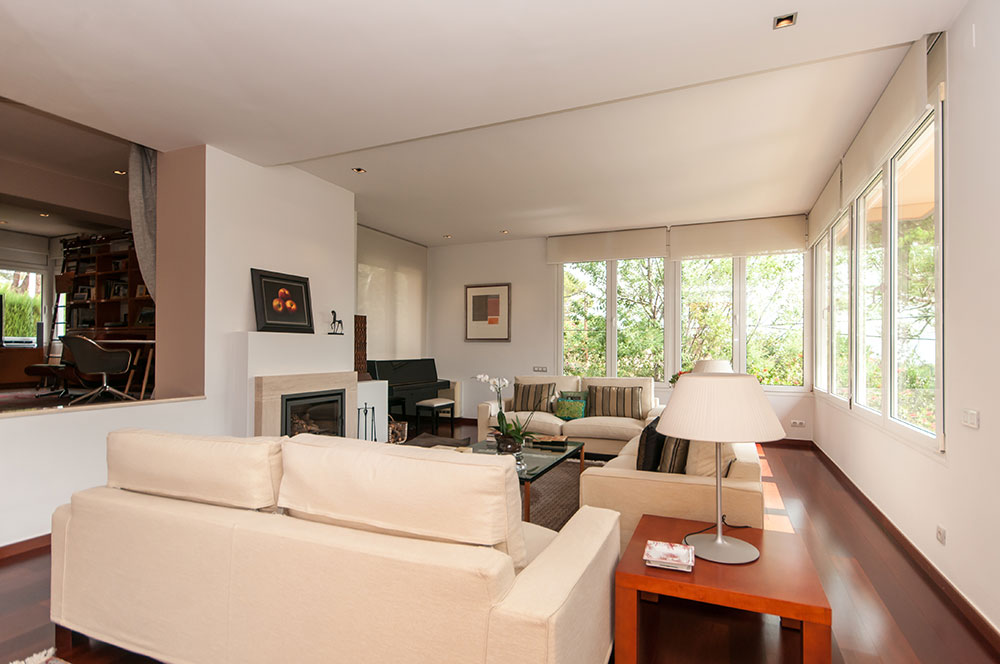 A la primera planta destaca la gran sala d’estar, dividida en tres nivells, amb terrassa; l’amplia cuina office i una habitació de servei. A la planta baixa hi ha 2 suites també amb terrassa i un gran vestidor, dues habitacions dobles amb bany complet i un elegant despatx amb llar de foc. Al soterrani trobem un bonic celler, una sala habilitada com a gimnàs i una sala polivalent amb accés al jardí.