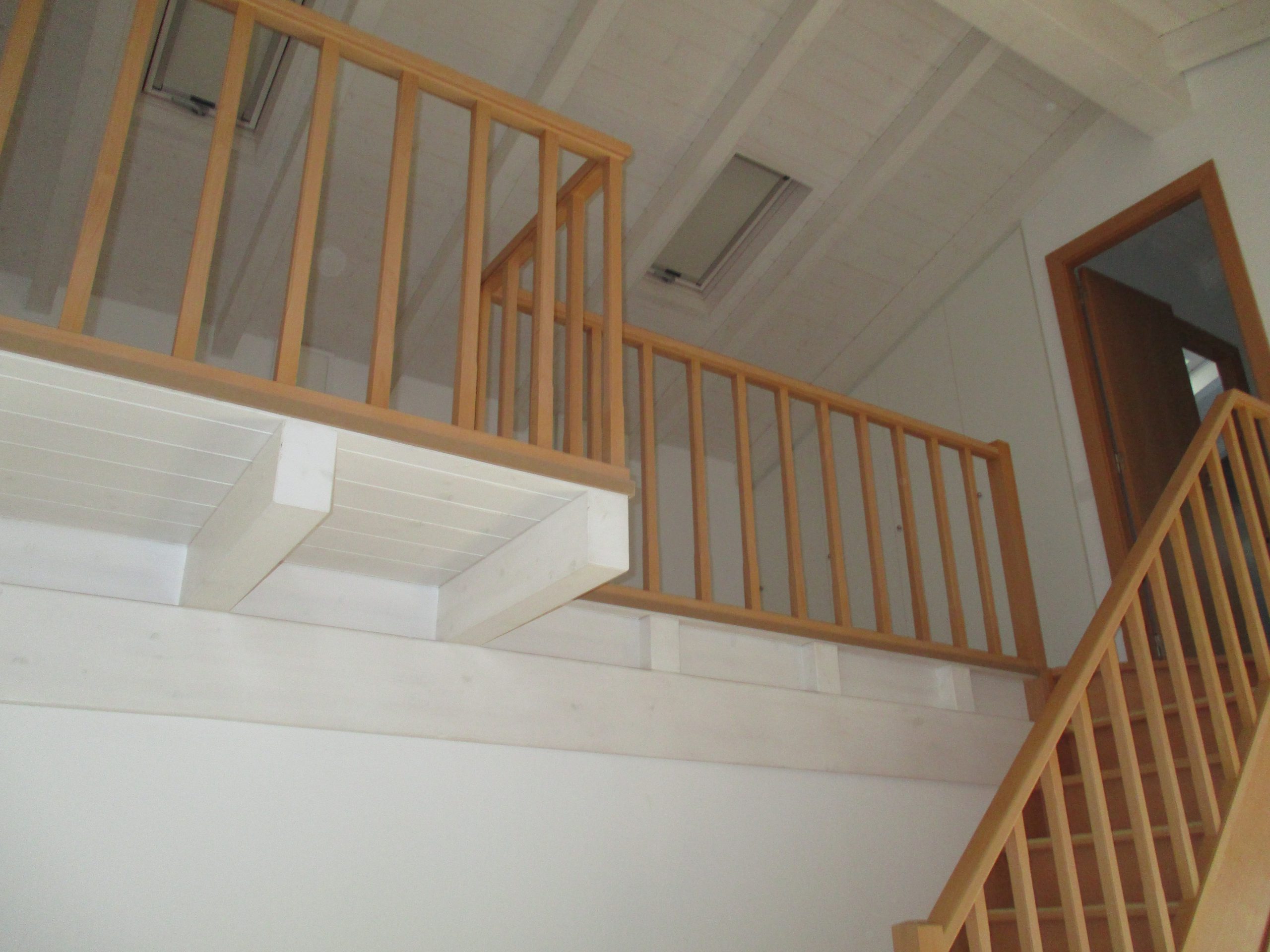 The distribution is structured around a wooden staircase that joins the two floors.